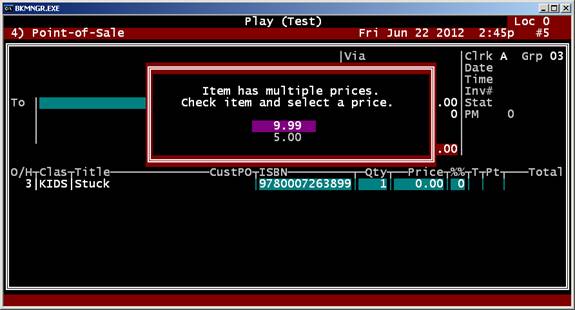 Notice that the indicator code is in red. This means that the code entered is recognized and is active. The POS will use the special pricing as given in the code (in this case, the POS will give a 25% discount to the item automatically when it is entered in a sale.) The codes are as follows (and can be entered anywhere in the Notes field): //% - this applies the number after the % as a discount in the POS. This is used to automatically discount and item (e.g. //%20 would apply a 20% discount to the item.) You can also use this code to PREVENT a POS discount from ever being applied to an item, by using a //%0. In this case, even if the customer is set up to get a blanket discount on all purchases, the item will NOT be discounted. This is most useful on items where there is a short discount or net pricing, where you would not wish to further discount the item. //$ - this applies the price after the $ instead of the regular price. This is used for a temporary sale (e.g. //$5.99 would substitute $5.99 as the selling price in the POS.) //@ - in the POS, the regular price and this price will be displayed and the user must pick one. For example: