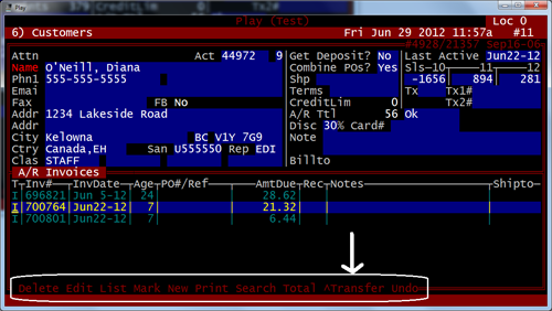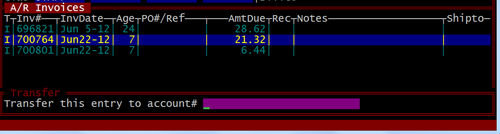 - - - - - - - - - - - - - - - - - - - - - - - - - - - WHOOPS! Did you accidentally apply an invoice or a payment to the wrong account? Have no fear - the TRANSFER function is here! Mistakes happen, or even mixups with the billto of certain customer accounts, so there is a fix in place that will allow you to move something from one customers accounts receivable over to anothers. Go to #6 Customers and view the account you wish to correct - simply hit A for A/R and arrow down to the entry you wish to transfer.