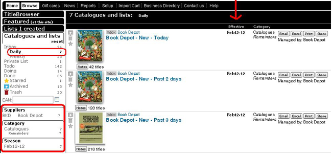 To see what Book Depot has to offer, use your WebStore and from Browse Books choose Supplier BKD. The Order cart will reveal the net price. Then try the Browse --> Lists and Catalogues and select Book Depot from the supplier list. Their latest arrivals should be listed there. Mosaic's Book Depot rep is Jennifer Harwood, and she can be reached at 905-388-0253 or jennifer@bookdepot.com